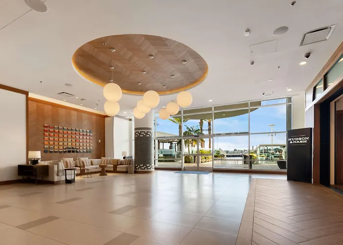 Dette komfortabel 4-stjernet Hilton San Diego Bayfront tilbyder overnatnings nær PETCO Park og udsigt over øerne. Horton Plaza butikscenter og Coronado Færgeanløb kan nås på henholdsvis 15 minutters gang og 25 minutters gang.